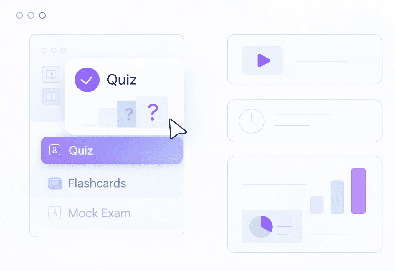 StudyTech builds quizzes, flashcards, and mock exams from your specific gaps. Every session hits your weakest domains first. As you improve, your plan updates in real-time — so you're never wasting time on what you already know.