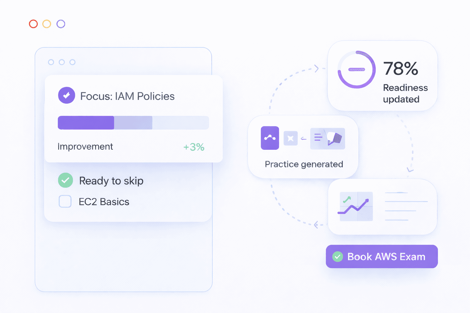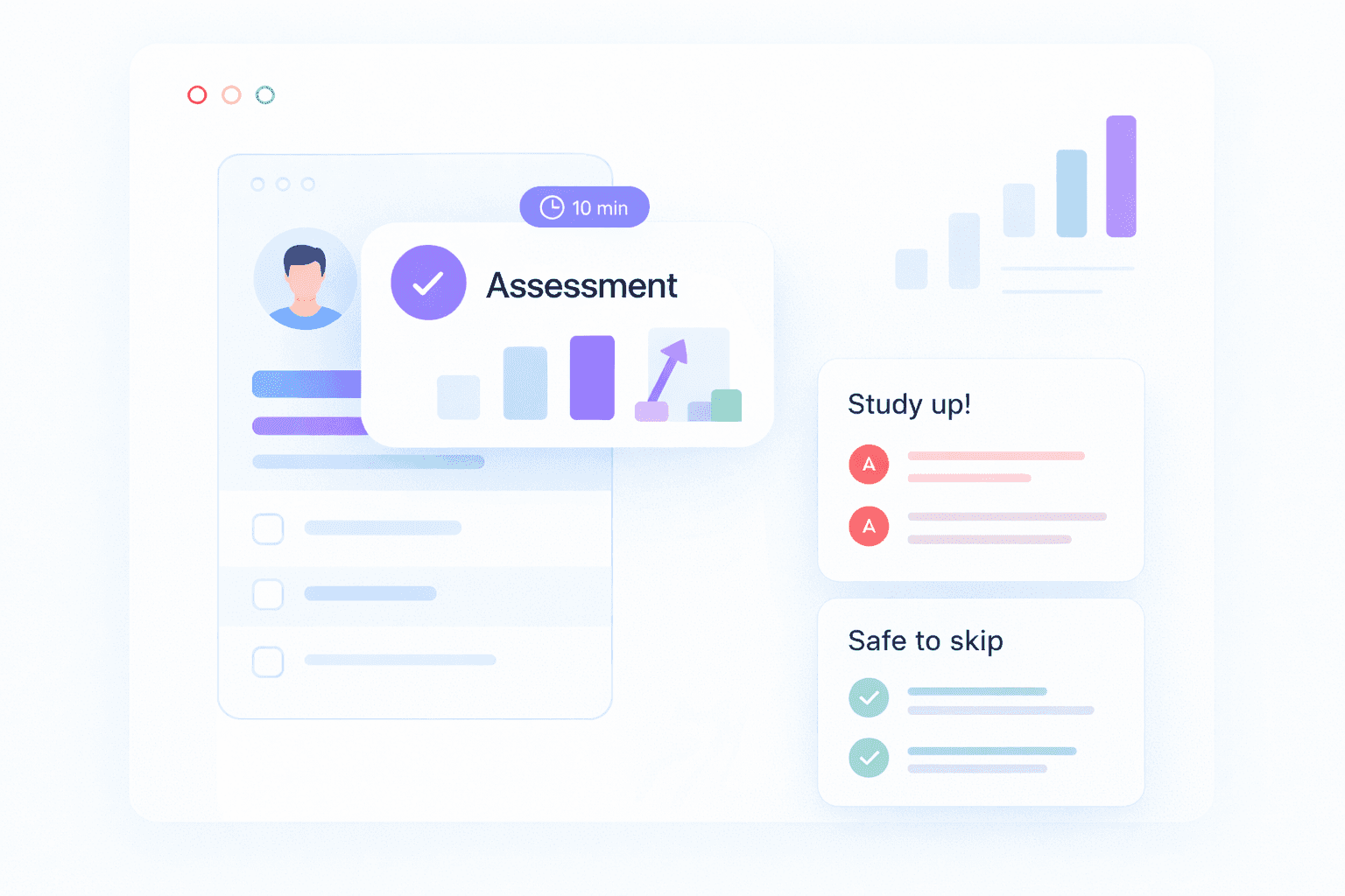 Take a 10-minute adaptive assessment. StudyTech scores you by domain, highlights the topics dragging your score down, and shows you what you can safely skip. No more guessing what to study next.